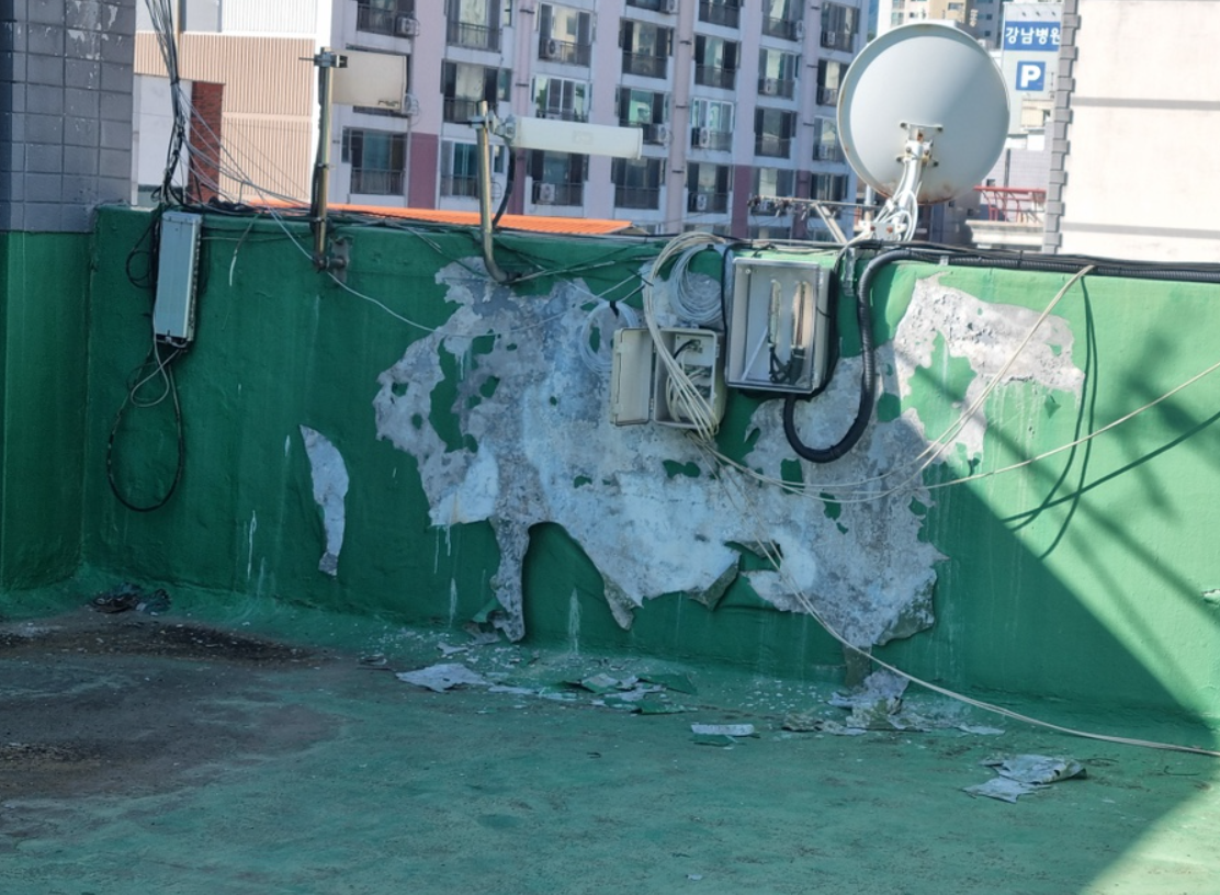 벗겨지고 탈락되는 기존 옥상 방수층들